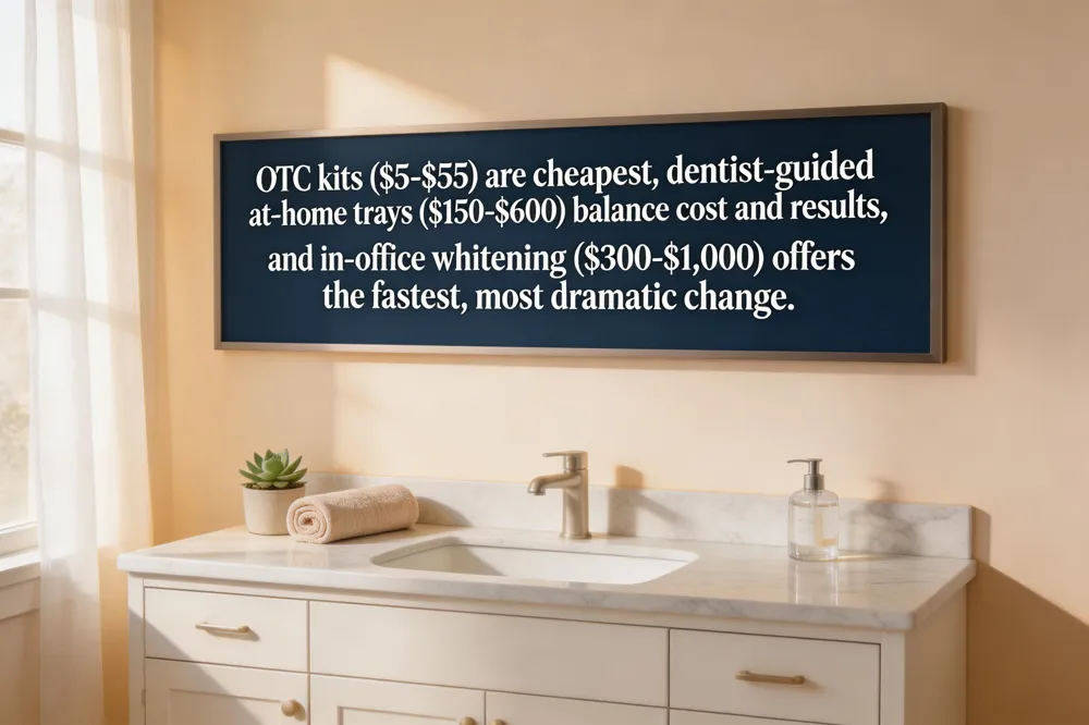 In summary, OTC kits provide low‑cost convenience, professional office whitening delivers the fastest, most dramatic results at a higher price, and dentist‑prescribed trays balance effectiveness and cost while ensuring safety.