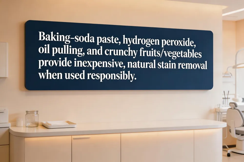 Simple remedies include baking‑soda paste, coconut‑oil oil pulling, and chewing apples or celery for mechanical cleaningColgate. These low‑cost options, when used responsibly, can brighten teeth without compromising enamel.