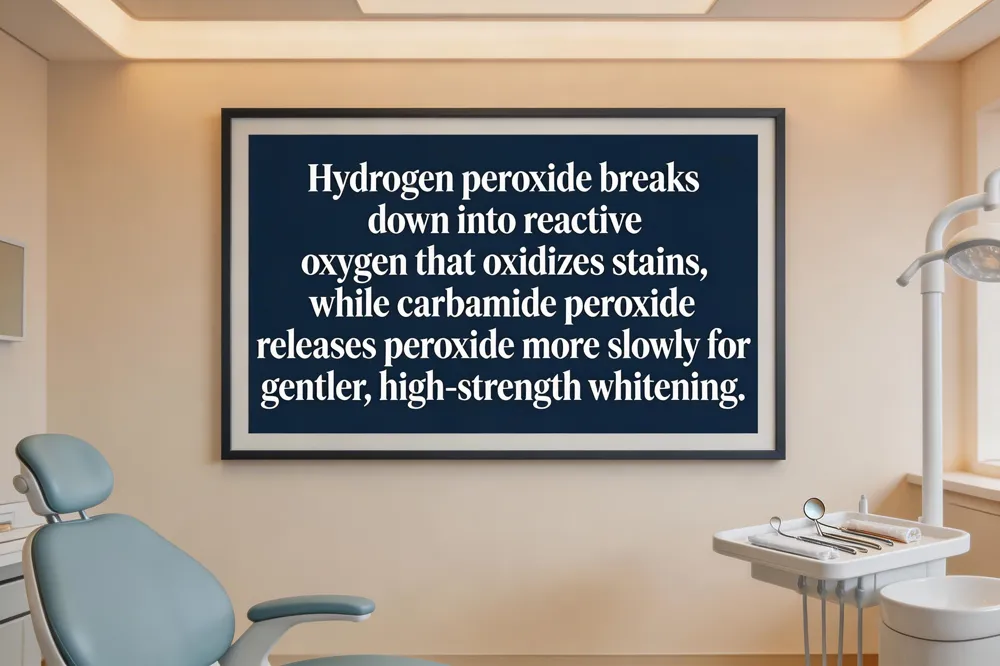 Hydrogen peroxide and carbamide peroxide are the workhorses of modern at‑home and professional whitening. Hydrogen peroxide (H₂O₂) breaks down into water and oxygen, releasing reactive oxygen molecules that oxidize chromogens within the enamel and dentin, lifting stains. Carbamide peroxide is a more stable compound that decomposes into hydrogen peroxide and urea; the urea helps keep the gel moist and releases peroxide more slowly, allowing higher concentrations (up to 35 % carbamide peroxide, equivalent to ~12 % H₂O₂) with a gentler effect on soft tissues.