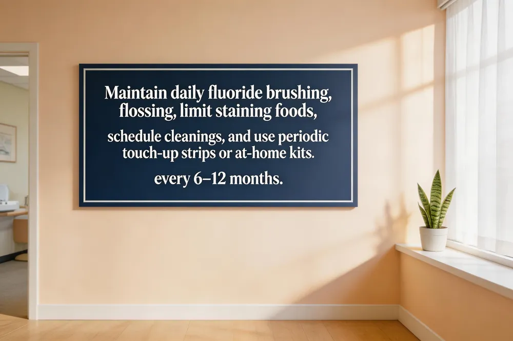 A solid daily oral‑hygiene routine—brushing twice with fluoride toothpaste, flossing, and using a whitening toothpaste—creates a clean surface for any whitening product to work. Pair this with smart dietary habits: limit coffee, tea, red wine, and sugary snacks, and rinse or use a straw when you do indulge. Schedule professional dental cleanings every six months to remove plaque and tartar that can dull results. For long‑term brightness, follow a touch‑up schedule of a brief at‑home kit or a single strip treatment every 6‑12 months.