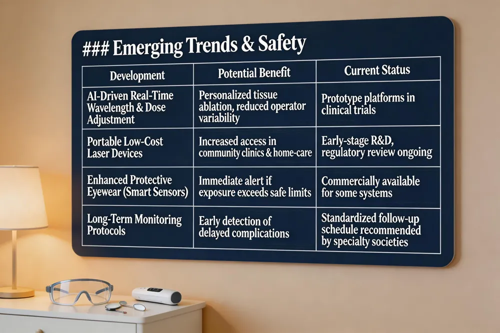 | Emerging AI‑driven laser systems promise real‑time adjustment of wavelength and power, allowing clinicians to personalize tissue ablation while minimizing thermal damage. At the same time, portable, low‑cost devices are being developed to bring minimally invasive periodontal care to community clinics and even home‑care settings. Safety protocols remain essential: clinicians must wear protective eyewear and calibrate settings for each tissue type, and follow strict sterilization procedures. Contraindications include pregnancy, photosensitivity, pacemaker presence, and uncontrolled systemic disease. Long‑term monitoring involves regular periodontal charting, radiographs, and maintenance visits to assess attachment stability and detect any delayed complications. | ||