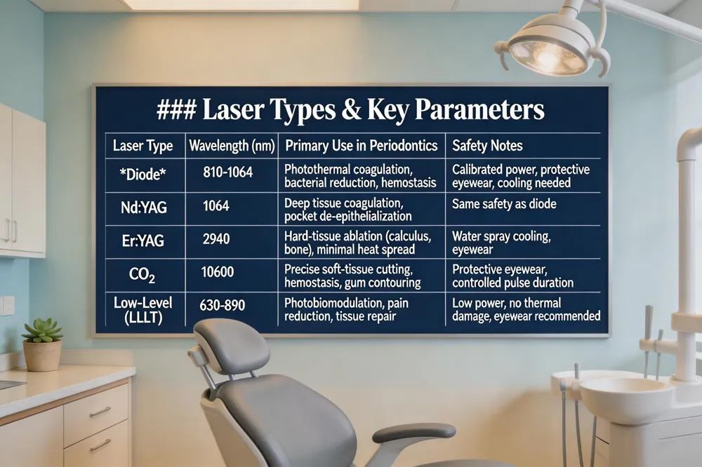 | Diode (810‑1064 nm), Nd:YAG (1064 nm), Er:YAG (2940 nm) and CO₂ (10 600 nm) lasers each target specific periodontal tissues. Diode and Nd:YAG lasers provide photothermal effects that coagulate vessels, reduce bacterial load and aid hemostasis, while Er:YAG and CO₂ lasers efficiently ablate calculus and hard tissue with minimal heat spread. Low‑level photobiomodulation (red‑near‑infrared 630‑890 nm) stimulates fibroblasts, collagen and angiogenesis, accelerating soft‑tissue repair. Safety protocols require calibrated power settings, protective eyewear for patient and staff, and cooling to prevent thermal injury; contraindications include pregnancy, photosensitivity, pacemakers and uncontrolled systemic disease. Emerging AI‑driven laser platforms promise real‑time wavelength selection and dose optimization, enhancing precision and reducing operator variability. |