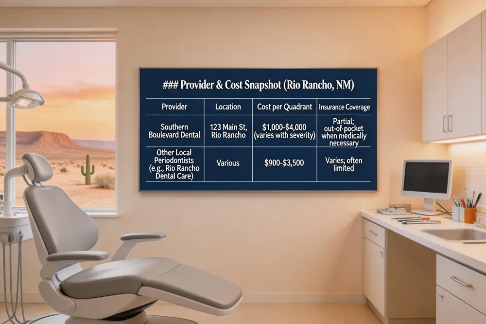 | Laser assisted periodontal therapy cost ranges from $1,000‑$4,000 per quadrant (≈$2,000‑$8,000 for a full mouth), with insurance coverage variable; Southern Boulevard Dental offers a complimentary consultation for personalized estimates. |