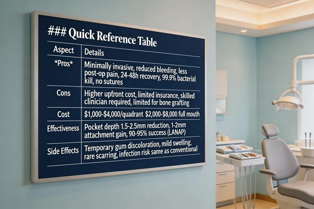 Overall effectiveness of laser therapy is strong for appropriate candidates, showing significant pocket‑depth reductions, clinical attachment gains, and lower risk of tooth loss. Choosing laser over conventional methods should consider disease severity, pain tolerance, budget, and the clinician’s expertise with laser protocols. A personalized consultation with a qualified periodontist ensures the best fit for each patient’s gum‑health goals.