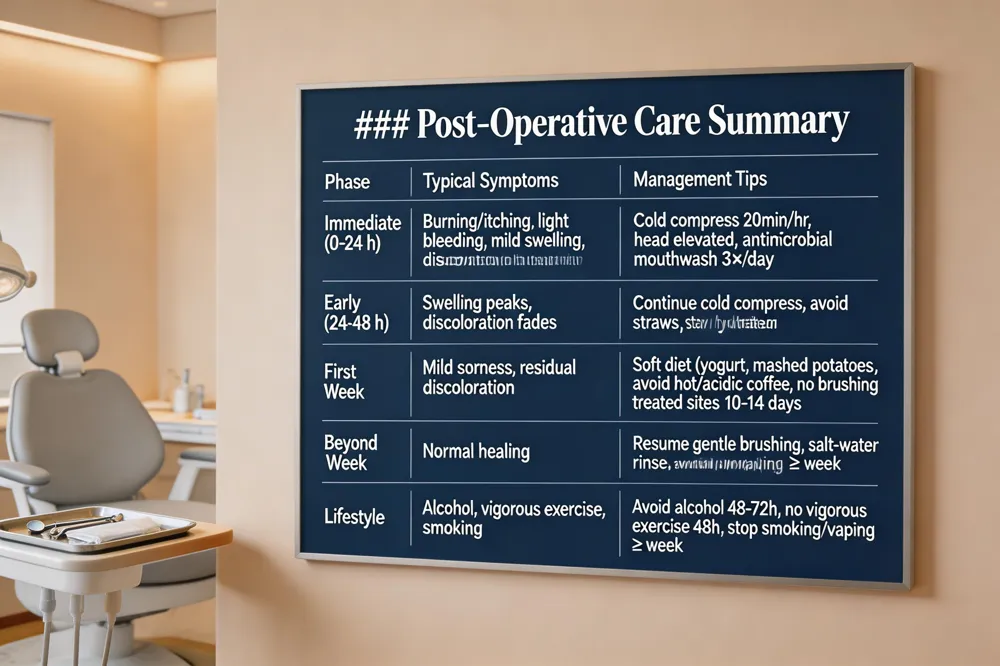 Practical post‑operative care tips – Follow your dentist’s instructions: rest with the head elevated for the first 24‑48 hours, apply a cold compress (20 min on/off) for the initial 36 hours, and then switch to moist heat if needed. Use a gentle salt‑water or chlorhexidine rinse twice daily, avoid brushing the treated area for 48 hours, and keep the mouth clean with a soft‑bristled toothbrush around the site after a week.
