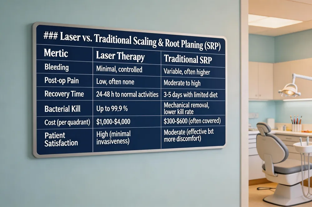 | Real‑world patient feedback consistently highlights the gentle nature of laser periodontal therapy. Many describe a "minimally invasive" experience with little bleeding, reduced swelling, and a quick return to normal activities, especially when compared with traditional scaling and root planing (SRP). Clinical reviews confirm that lasers can disinfect deep pockets, achieve up to a 99.9 % bacterial kill rate, and promote faster tissue healing, though systematic reviews note that long‑term, large‑scale studies are still limited. |
