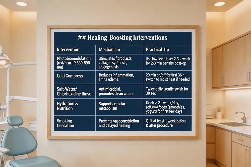 Lifestyle choices that influence recovery – Stay well‑hydrated, quit smoking, limit alcohol, and avoid hot, spicy, or acidic foods that can irritate the gums. Eat soft, cool foods (smoothies, yogurt, mashed potatoes) for the first few days, then transition to soft solids. Regular gentle oral hygiene and a balanced diet support tissue regeneration.