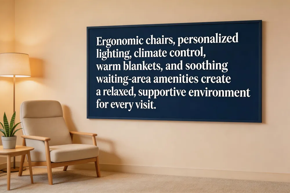 Patient‑centered care (PCC) is an approach that respects each patient’s preferences, needs, and values, involving them in decision‑making and tailoring treatment plans to improve outcomes and satisfaction. Modern offices enhance physical comfort with ergonomic dental chairs that feature memory settings for recline, head‑rest height and lumbar support, allowing every patient to find a relaxed posture quickly. Adjustable lighting and climate control let the team create a soothing ambiance—soft LEDs, natural‑light simulation, and temperature that can be personalized for each visit. Warm blankets and neck pillows add a tactile sense of security, especially during longer procedures, while comfortable waiting‑area amenities such as plush seating, free Wi‑Fi, charging stations, and calming music reduce pre‑appointment stress. Together, these elements transform the dental experience into a calm, supportive environment that aligns with the core principles of patient‑centered dentistry.