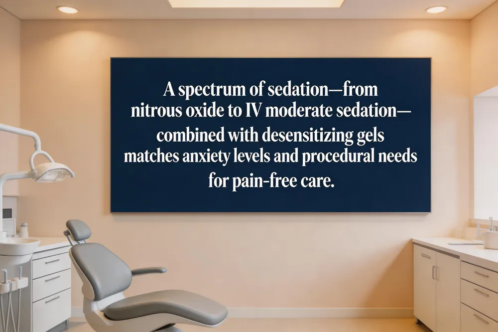 Modern dental practices offer a spectrum of sedation and pain‑management options that can be matched to each patient’s anxiety level and procedural needs. Nitrous oxide (laughing gas) provides a quick, mild calming effect that wears off within minutes, allowing patients to drive home safely. Oral conscious sedation, using medications such as diazepam, induces a deeper “twilight” state for more anxious individuals while keeping them responsive. For longer or more invasive procedures, IV moderate sedation delivers precise control of the sedation depth, monitored continuously for safety. In addition, desensitizing gels applied before local‑anesthetic injections numb the tissue, dramatically reducing needle pain and the associated fear.