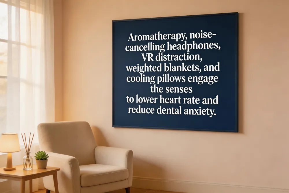 Modern dental offices use a suite of sensory‑based tools to calm nervous patients and create a soothing treatment environment. Aromatherapy with lavender, chamomile or peppermint essential oils diffused in the operatory lowers heart rate and promotes relaxation. Noise‑cancelling headphones block the high‑pitched whine of drills, allowing patients to listen to music, audiobooks or white‑noise, which has been shown to reduce perceived pain. Virtual‑reality distraction therapy immerses patients in calming visual worlds, diverting attention from the procedure and diminishing anxiety. Weighted blankets and cooling pillows provide gentle, consistent pressure and temperature control, offering a sense of security and comfort during longer appointments.