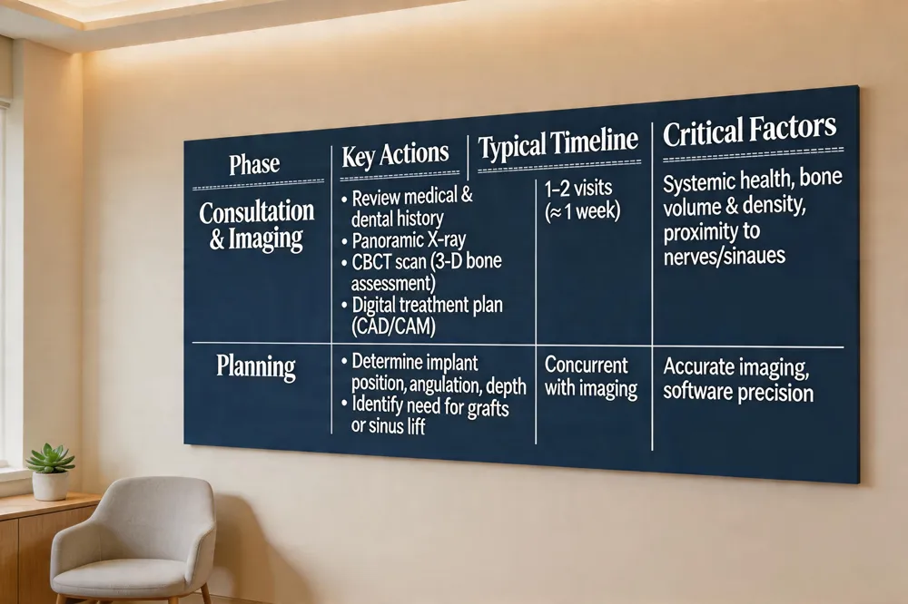 The first step in a dental implant journey begins with a thorough review of the patient’s medical and dental history, allowing the clinician to uncover any systemic conditions, medications, or previous oral issues that could affect implant success. A detailed diagnostic work‑up follows, typically employing a panoramic X‑ray for an overall view of the dentition and a cone‑beam computed tomography (CBCT scan) that delivers high‑resolution, three‑dimensional images of the jawbone. These scans enable the dentist to assess bone volume, density, and the proximity of vital structures such as nerves and sinuses. With this data, a personalized digital treatment plan is created using CAD/CAM technology, which maps the optimal implant position, angulation, and depth while also planning for any necessary bone grafts or sinus lifts. This patient‑centered, technology‑driven approach ensures that each implant is placed with precision, laying a solid foundation for a durable, natural‑looking restoration.