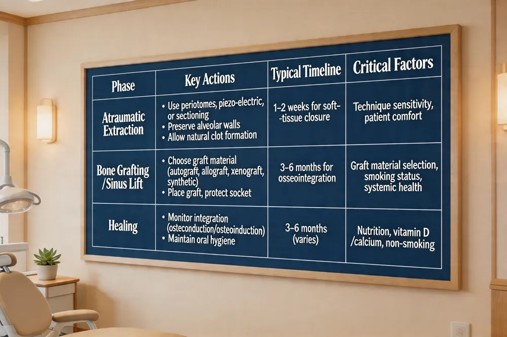 Atraumatic extraction techniques focus on preserving the alveolar walls and minimizing trauma to the surrounding bone. Using periotomes, piezo‑electric instruments, or sectioning the tooth helps keep the socket intact, allowing a natural clot to form and soft‑tissue to heal within 1‑2 weeks. When the post‑extraction socket lacks sufficient height or width, a bone graft or sinus lift becomes necessary to create a stable foundation for the future implant. Graft materials range from autografts (patient’s own bone) to allografts, xenografts, and synthetic calcium‑phosphate composites; each supports new bone formation differently, but all aim to achieve a dense, vascularized matrix. Typical graft healing periods span 3‑6 months, depending on the graft size, material, and patient factors such as smoking or systemic health. During this time, the graft integrates through osteoconduction and, when applicable, osteoinduction, gradually replacing the graft material with native bone. A well‑chosen graft material, combined with proper surgical technique, enhances long‑term implant stability by preserving ridge dimensions and providing adequate bone density for osseointegration.