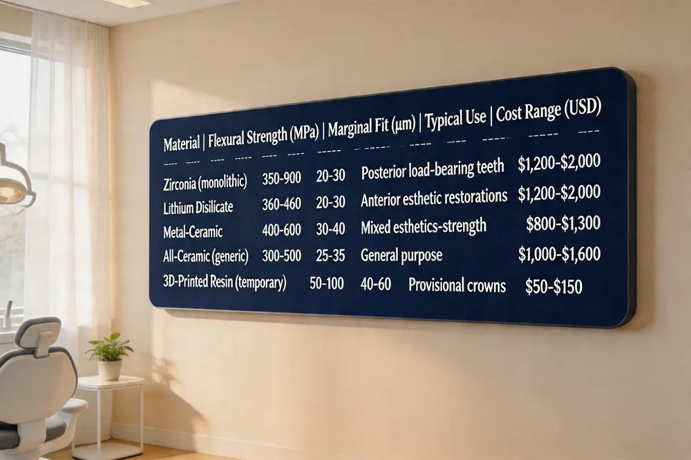 | Material | Flexural Strength (MPa) | Marginal Fit (µm) | Typical Use | Cost Range (USD) |