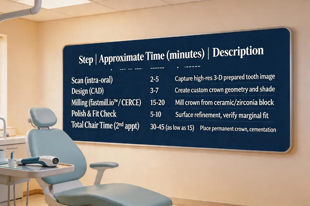 Chairside milling transforms a traditional multi‑visit crown process into a single‑appointment workflow. After the tooth is prepared, a fast intra‑oral scanner captures a high‑resolution 3‑D image that the dentist uses to design a custom crown using CAD software. The design is sent instantly to an in‑office mill, which carves the restoration from a solid ceramic or zirconia block. Modern units such as the fastmill.io™ or CEREC systems complete the milling cycle in roughly 15–20 minutes, followed by a quick polish and fit check. Because the crown is fabricated on site, the patient never needs a temporary restoration and can leave the office with a permanent, cemented crown in the same visit. The total chair time for the second appointment—removing the temporary, trying in the final crown, making any minor adjustments, and cementation—typically ranges from 30 to 45 minutes, and many cases finish in as little as 15 minutes when fit is perfect. This streamlined process not only saves patients time and reduces the inconvenience of multiple trips, it also increases practice efficiency and case acceptance, delivering durable, aesthetically pleasing crowns in under an hour from scan to placement.