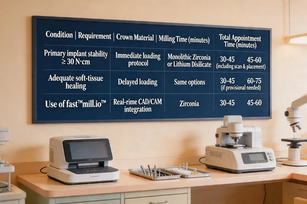 | Primary implant stability ≥ 30 N·cm | Immediate loading protocol | Monolithic Zirconia or Lithium Disilicate | 30‑45 | 45‑60 (including scan & placement) |