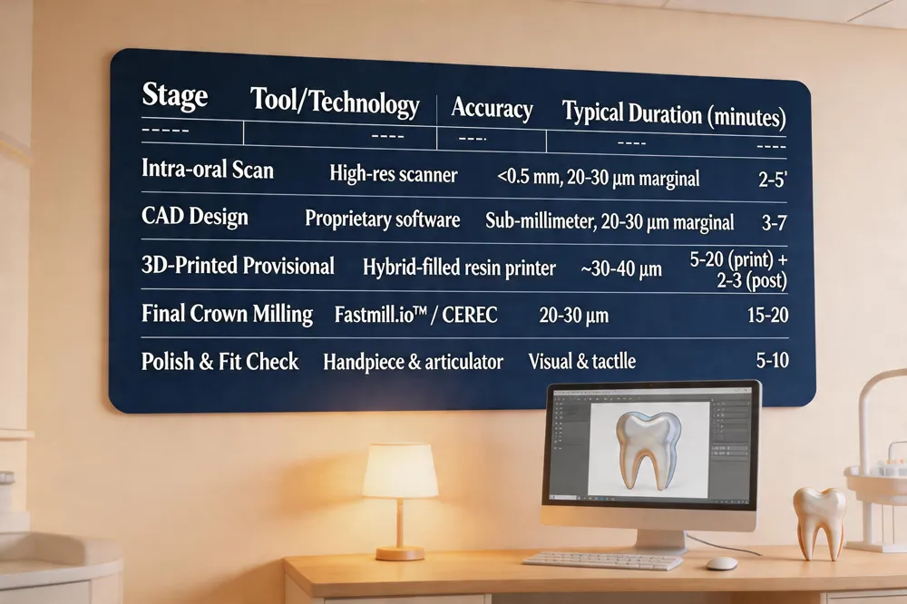| 3D‑Printed Provisional (if needed) | Hybrid‑filled resin printer | ~30‑40 µm | 5‑20 (print) + 2‑3 (post‑process) |
