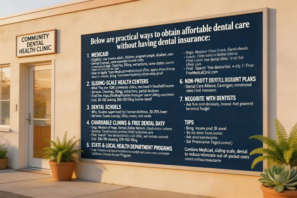 Low cost dental care for uninsured – Take advantage of cash‑pay discounts, membership clubs, local free‑clinic events, school‑based clinics, and Medicaid‑eligible programs.