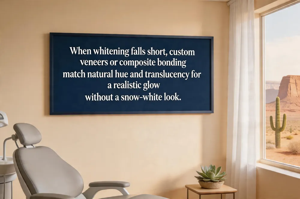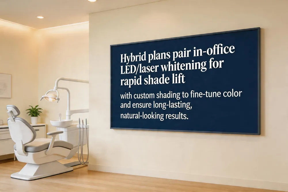 Hybrid treatment plans combine the rapid, dramatic shade lift of professional light‑activated whitening with the precise, lasting color matching of custom shading. In a typical protocol, a patient first undergoes an in‑office LED or laser‑activated whitening session that can lift teeth 3‑8 shades in a single 45‑60‑minute visit. Professional teeth whitening before and after shows an immediate, uniform brightening—often 7‑8 shade levels—captured in before‑and‑after photos that highlight a whiter, more radiant smile. After the whitening phase, the dentist evaluates any residual intrinsic stains or uneven translucency and applies custom‑matched composite or porcelain veneers to restore natural depth and harmony. This balance of brightness and translucency prevents the ‘over‑white’ look while preserving enamel health. Long‑term shade stability is supported by the durability of the custom restoration, which resists staining for 5‑15 years, and by routine oral‑hygiene practices that limit new extrinsic stains. Together, these steps deliver a realistic glow that lasts, giving patients confidence and comfort in their smile.