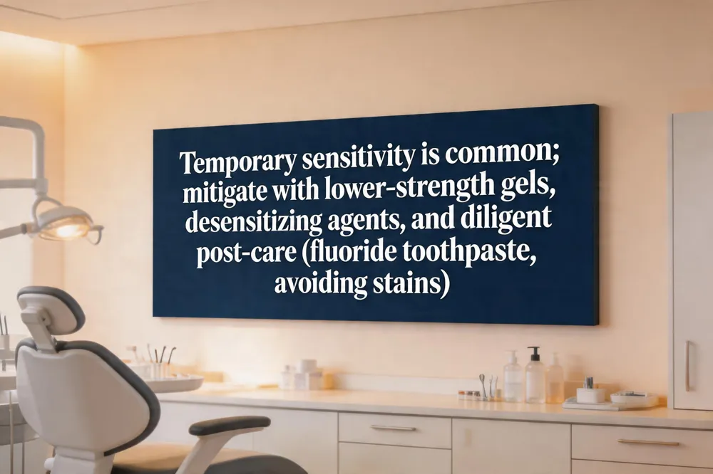 Common side effects of whitening include temporary tooth sensitivity and mild gum irritation, which usually resolve within a few days when the gel is applied correctly and protective barriers are used. Managing sensitivity can be achieved by using lower‑strength peroxide gels, adding desensitizing agents such as potassium nitrate, and spacing treatment sessions. Post‑treatment care is essential: brush twice daily with a non‑abrasive fluoride toothpaste, floss, rinse with a gentle mouthwash, and avoid staining foods and drinks for at least 24‑48 hours. Using a straw for coffee, tea, or wine further reduces re‑staining risk.