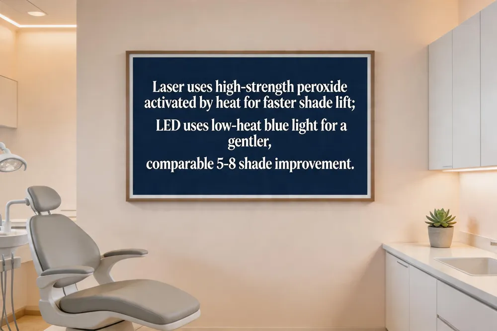 laser activation versus LED light: Laser whitening uses a high‑strength peroxide gel activated by a focused light or laser, accelerating the bleaching reaction with heat. LED whitening employs a low‑heat blue light that simply catalyzes the peroxide gel, making it gentler on gums. In‑office cost range: Laser sessions typically cost $800‑$1,200 per visit, while LED‑based in‑office treatments run $500‑$1,000. Effectiveness and shade gain: Both can lift 5‑8 shades in one appointment, but laser’s heat may achieve slightly faster results; LED provides comparable shade improvement with lower sensitivity risk. Comparison of treatment duration: Laser appointments last 15‑60 minutes; LED sessions are similar in length but may require a second activation cycle.