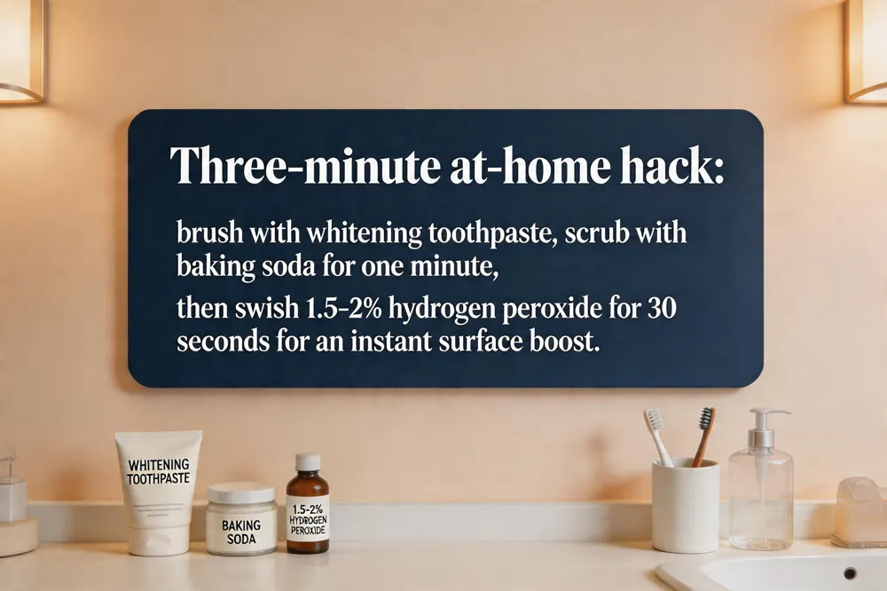 For a rapid smile lift, try a three‑minute whitening hack: brush with a whitening toothpaste, then scrub the front teeth for one minute using a dab of baking soda on a damp brush, followed by a 30‑second swish of a 1.5‑2% hydrogen‑peroxide rinse. Rinse and finish with a brief normal brush. Although this offers a temporary boost, lasting results need professional or consistent at‑home treatment. A two‑minute home routine can polish surface stains but won’t change intrinsic color; over‑use of acidic or abrasive agents may damage enamel and cause sensitivity. For a one‑day toothpaste boost, brush twice a day with a peroxide‑ or baking‑soda toothpaste, add a thin homemade paste (baking soda + 1–2% peroxide) for 30 seconds, and rinse well. To achieve noticeable whitening in a single day at home, use a dentist‑approved peroxide strip or low‑strength tray as directed, brush first, avoid staining foods, and manage any sensitivity with fluoride or desensitizing gel. These short‑term methods brighten surface stains, while professional LED or custom at‑home kits provide deeper, longer‑lasting results.