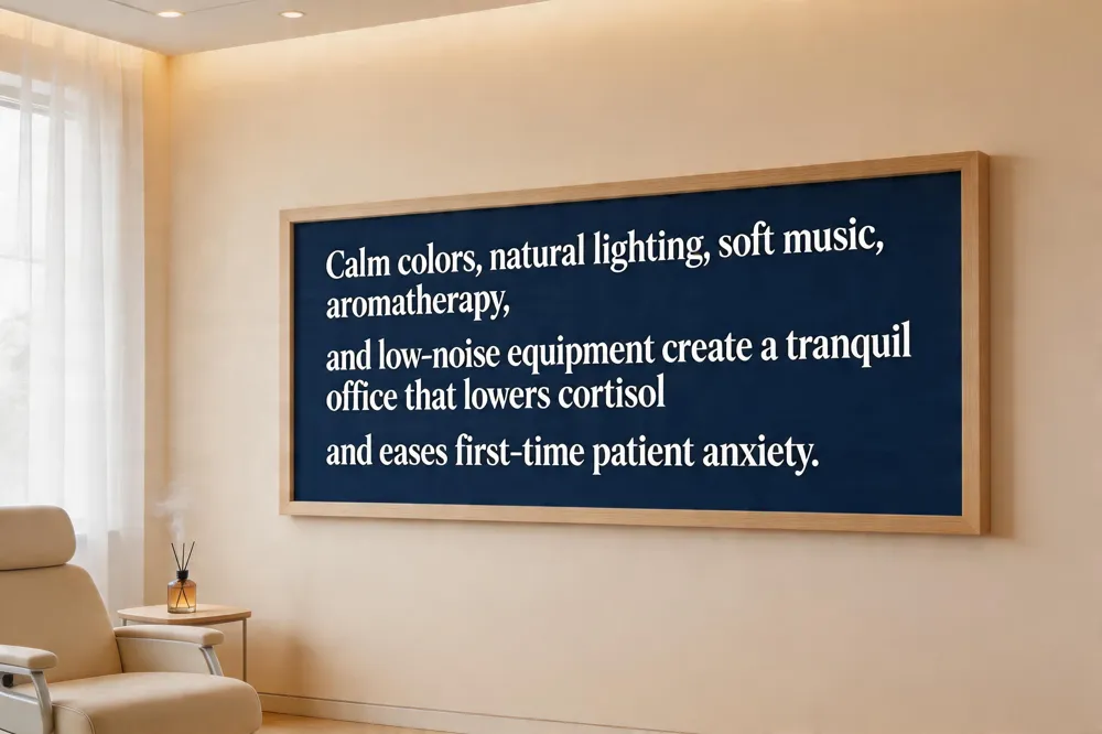 A calm dental office begins with a neutral color palette—soft blues, greens, or earth tones—paired with gentle, soft lighting that mimics natural daylight. These visual cues lower cortisol and help first‑time patients feel safe. Complementary background music at low volume, subtle aromatherapy (lavender) or citrus), and sound‑proofing of treatment rooms reduce auditory stressors such as drill noise, creating a quieter, more relaxing atmosphere.