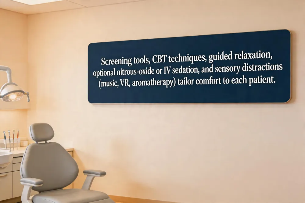 Screening tools such as the CDAS, MDAS, and DFS help us identify patients with high dental fear before the chair. Once anxiety is detected, we employ behavioral techniques—systematic desensitization, guided relaxation, deep‑breathing, and progressive muscle relaxation—to teach patients coping skills. Cognitive‑behavioral therapy (CBT) is integrated into visits, allowing patients to reframe negative thoughts and gradually confront feared dental cues, which reduces the need for heavy sed. For moderate to severe anxiety, pharmacologic options are offered: nitrous‑oxide inhalation, oral anxiolytics (e.g., diazepam) (https://www.dentalassociates.com/blog/7-ways-calm-dental-anxiety-and-fear-dentist), and, when appropriate, IV sedation such as midazolam or propofol, administered under strict monitoring. Distraction tools—soft music, headphones, tablets, or virtual‑reality headsets—shift focus away from drills and needles. Aromatherapy with lavender or citrus scents further lowers cortisol and blood pressure, creating a soothing atmosphere. By combining early screening, evidence‑based behavioral strategies, optional sedation, and sensory distractions, Southern Boulevard Dental provides a calm, patient‑centered experience that encourages regular preventive care and reduces dental anxiety.
