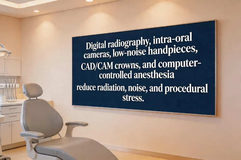 Modern low‑noise equipment, including digital intra‑oral cameras, silent handpieces, and digital radiography, shortens chair time and cuts down on unsettling sounds. These tools also emit less radiation, reinforcing patient trust.