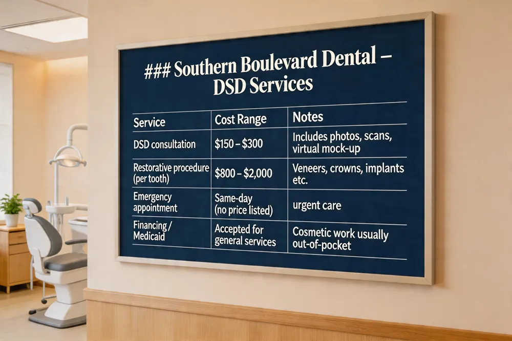 DSD consultation at Southern Boulevard Dental costs $150 – $300; prices depend on cosmetic procedures—porcelain veneers, crowns or implants—ranging $800 – $2000 per tooth. Insurance usually does not cover cosmetic work, so out‑of‑pocket expense is amount. Our team will provide an estimate after DSD appointment so you know what to expect.