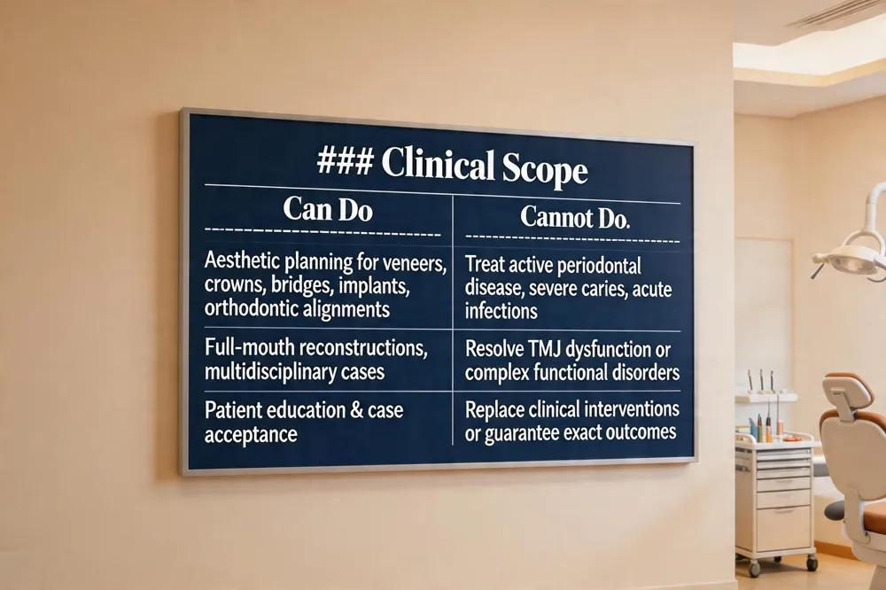 | Patient education & case acceptance | Replace clinical interventions or guarantee exact outcomes |