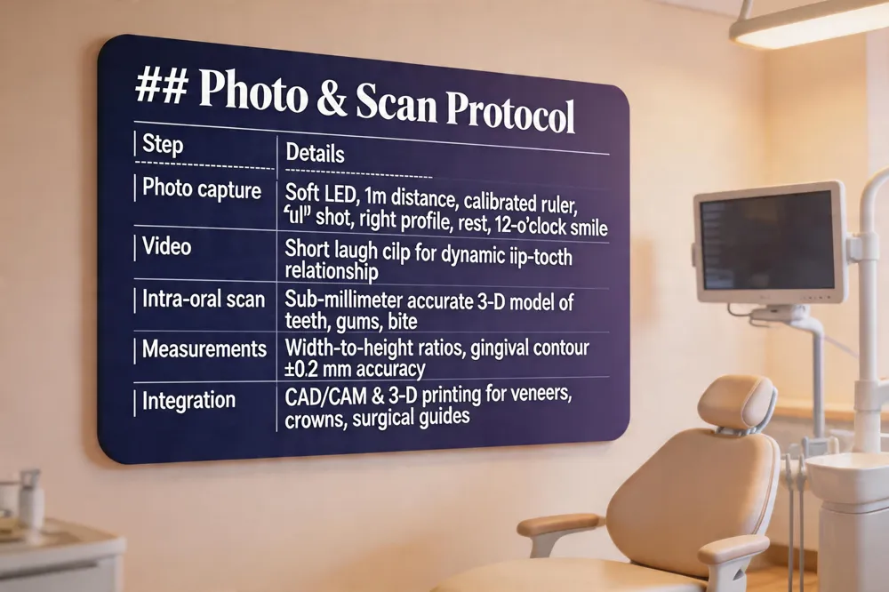 Digital Smile Design (DSD) begins with a strict photo‑ and capture protocol. Under consistent soft LED lighting, the patient is positioned one meter from a tripod‑mounted camera at eye level. A full‑face frontal smile, a relaxed frontal “m” shot, right‑profile smile and rest images, and a 12‑o’clock full‑smile view are taken, each including a calibrated ruler for scale. A short video of the patient laughing records dynamic lip‑tooth relationships. These high‑resolution photographs are complemented by intra‑oral scans that generate a sub‑millimeter accurate 3‑D model of the teeth, gums, and bite. The software measures tooth width‑to‑height ratios and gingival contours with an accuracy of ±0.2 mm, far surpassing traditional impressions. The digital mock‑up is then linked to CAD/CAM systems and 3‑D printers allowing precise milling of veneers, crowns, or surgical guides directly from the virtual design. This seamless integration ensures that the final restoration matches the patient’s approved simulation, minimizing chair‑time, revisions, and preserving natural tooth structure.