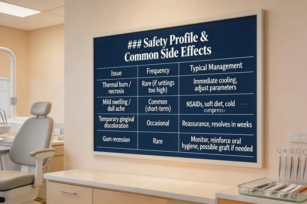 Common short‑term side effects are mild and short‑lived. Patients typically experience a dull ache, slight swelling, or light bleeding at the treatment site. A transient tingling or burning sensation during the procedure is normal, as is occasional temporary discoloration of the gingiva. Rarely, a brief recession or minor bite change may be noted, but these usually resolve as the tissue repairs.