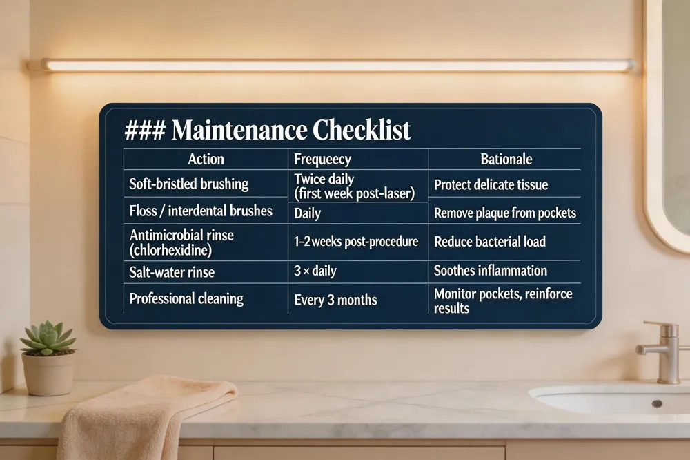 After laser gum therapy, follow the same routine but use a soft‑bristled brush for the first week, avoid hard foods, and rinse gently with warm salt water.