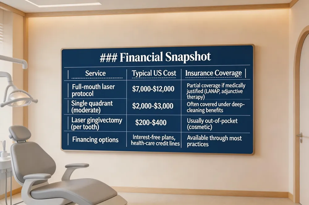 Insurance coverage is nuanced. Many dental plans cover deep‑cleaning and medically necessary laser procedures, often reimbursing a portion of LANAP or adjunctive laser therapy after prior authorization. Cosmetic laser work (e.g., gummy‑smile correction) is typically excluded and paid out‑of‑pocket. Patients should ask their provider to submit the appropriate codes and documentation to maximize benefits.