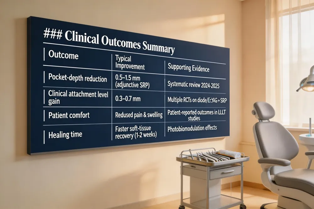 Pocket‑depth reduction and clinical attachment level gains – Studies show that adding low‑level laser therapy (LLLT) or diode/Er:YAG laser treatment to SRP typically lowers probing pocket depths by 0.5–1.5 mm and improves clinical attachment levels by 0.3–0.7 mm, especially in mild‑to‑moderate periodontitis.