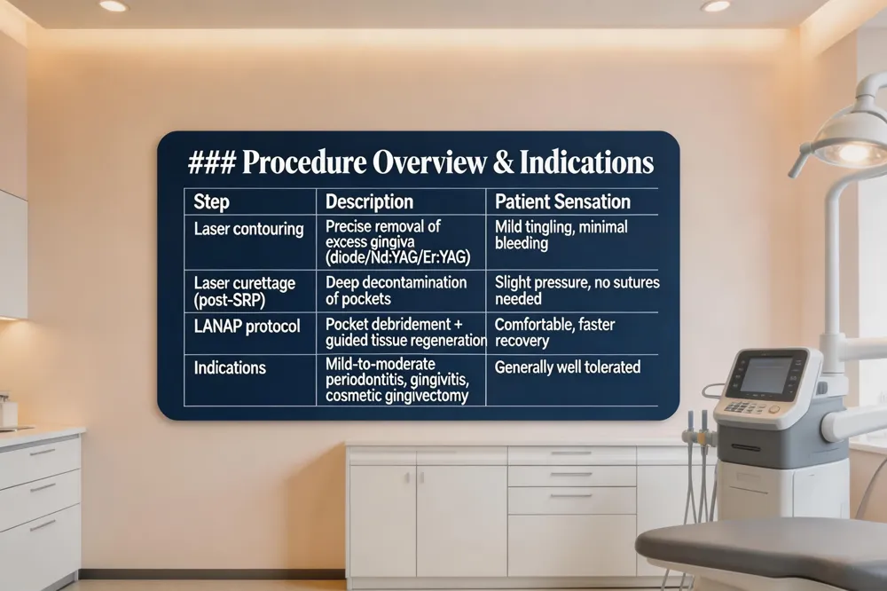 Pros and cons – Pros: minimally invasive, reduced bleeding, quicker recovery, patient comfort. Cons: higher cost, limited insurance coverage, mixed long‑term data for deep pockets.