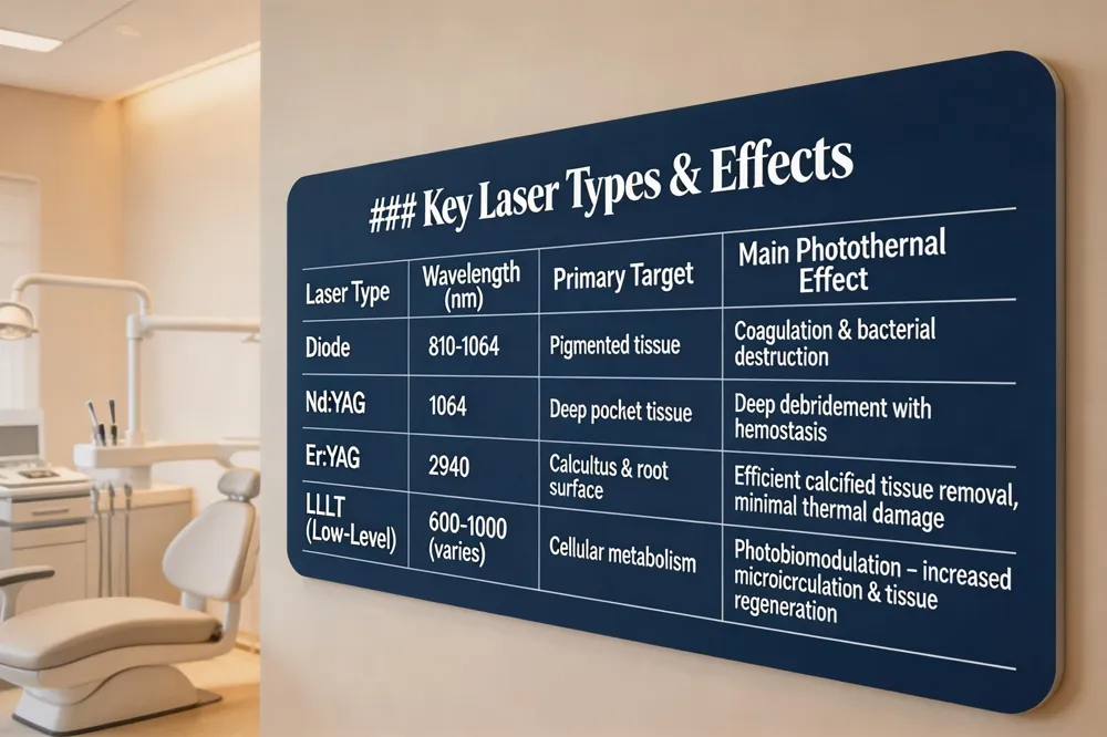| Laser therapy has become a valuable adjunct in modern periodontal care, offering precision, reduced bleeding, and faster healing compared with traditional mechanical debridement. The most common lasers used for gum disease are diode lasers (810‑1064 nm) that target pigmented tissue, Nd:YAG lasers (1064 nm) for deeper pocket debridement, and Er:YAG lasers (2940 nm) that efficiently remove calculus and decontaminate root surfaces while minimizing thermal damage. These wavelengths produce photothermal effects that destroy bacteria and coagulate vessels, and low‑level laser therapy (LLLT) provides photobiomodulation—stimulating cellular metabolism, increasing microcirculation, and accelerating tissue regeneration. |