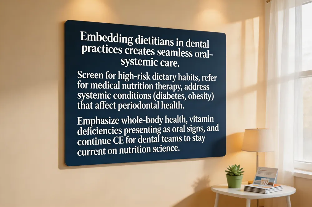 Embedding registered dietitians in dental practices creates a seamless bridge between oral health and nutrition, allowing clinicians to address the root causes of disease while patients receive coordinated care. Dental professionals can screen for high‑risk dietary habits—such as frequent free‑sugar intake and acidic beverage consumption—and refer patients to a dietitian for personalized medical nutrition therapy. This interprofessional model supports the oral‑systemic health connection: poor nutrition fuels cariogenic bacteria and inflammation, while systemic conditions like diabetes and obesity amplify periodontal risk. By integrating nutrition counseling into routine exams, dentists reinforce evidence‑based recommendations: limit added sugars, choose calcium‑rich foods (dairy or fortified alternatives), obtain adequate vitamin D, and prioritize fluoridated water to buffer plaque acids. Deficiencies often manifest first in the mouth; low vitamin A, B‑vitamins, C, D, or folate can cause leukoplakia, angular cheilitis, bleeding gums, and enamel defects, signaling the need for dietary intervention. Continuing education for dental teams—through CE courses, hands‑on workshops, and collaborative case reviews—ensures clinicians stay current on nutrition science and feel confident delivering brief, effective counseling. Together, these strategies promote whole‑body health, reduce caries and periodontal disease, and empower patients to make lasting, oral‑friendly lifestyle choices.