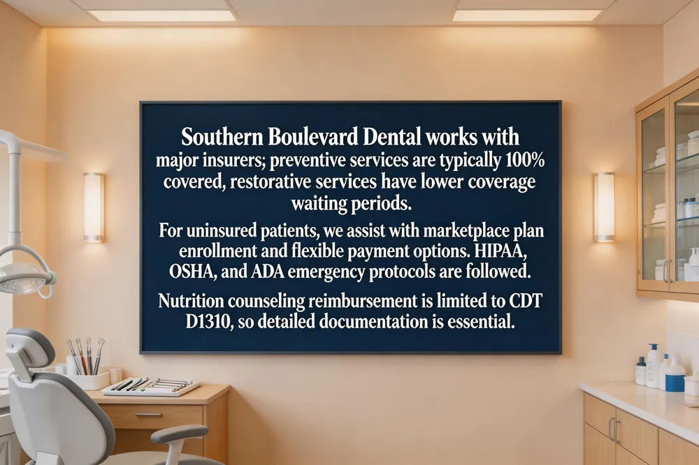 At Southern Boulevard Dental we strive to make oral‑health care affordable, safe, and comprehensive. Our staff works with most major dental insurance plans, helping you understand benefits, deductibles, and annual maximums. Preventive services such as exams, cleanings, and X‑rays are typically covered at 100 %, while restorative procedures receive lower percentages and may include waiting periods. For patients without dental coverage, we can guide enrollment in stand‑alone plans through the Marketplace and discuss flexible payment options for any out‑of‑pocket costs.