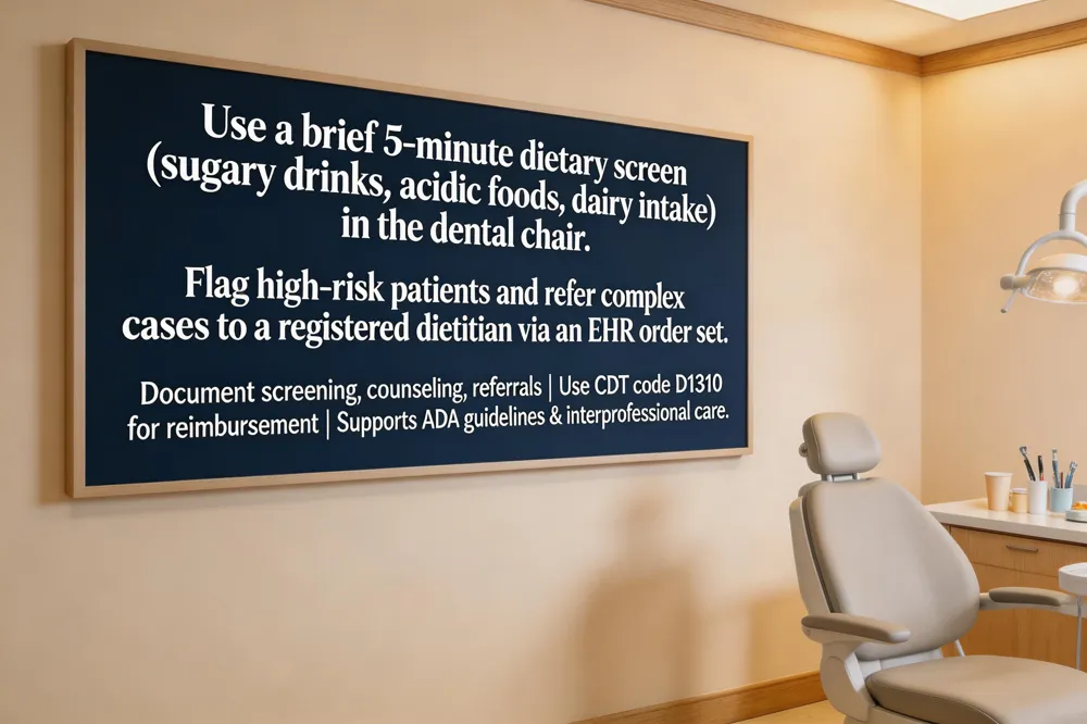 A brief dietary screening tool—such as a 5‑minute questionnaire asking about frequency of sugary drinks, acidic foods, and dairy intake—can be completed in the dental chair to flag high‑risk habits. When the screen indicates complex needs (e.g., uncontrolled diabetes, malnutrition, or persistent caries), the team should follow a clear referral pathway to a registered dietitian nutritionist (RDN). Referral can be made directly through the practice’s electronic health record (EHR) using a standardized order set that captures the patient’s oral‑health concerns and the RDN’s scope (nutrition counseling to control dental disease). Documentation of the screening results, counseling provided, and any referral is essential for continuity of care and billing (e.g., CDT code D1310). Integrating these steps into the EHR workflow ensures that nutrition assessments become a routine part of every exam, supports interprofessional collaboration, and reinforces the ADA’s guideline that nutrition is integral to oral health. By consistently screening, referring, and documenting, dental teams can help patients reduce free‑sugar exposure, increase calcium‑rich foods, and improve overall gum and enamel health.