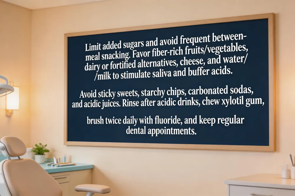 Dental diet advice – Keep added‑sugar low, avoid frequent between‑meal snacking, and pair sugary items with meals. Choose calcium‑rich foods (cheese, yogurt, nuts), raw vegetables, and drink water or milk throughout the day. Rinse after acidic drinks, chew xylitol gum, brush twice with fluoride, and schedule dental visits.