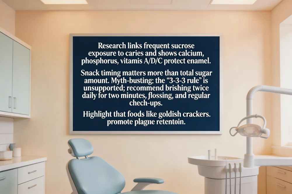 Myth‑busting is essential: The informal “3‑3‑3 rule” (brush three times a day for three minutes, then avoid food for three hours before bed) is not evidence‑based; we recommend brushing twice daily for two minutes, flossing, and regular check‑ups. Goldfish crackers cling to teeth and create a plaque‑friendly environment, which is why dentists advise against them. These concise, science‑backed messages empower patients to make healthier choices and support better oral outcomes.