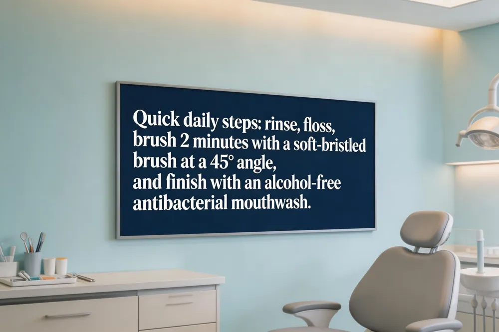 Morning and night, start with a quick rinse to loosen debris. Then floss or use a water‑flosser, cleaning between teeth and below the gum line. Brush for two minutes with a soft‑bristled brush and fluoride toothpaste, holding the bristles at a 45‑degree angle and using gentle circular motions on all surfaces, including the tongue. Finish with an alcohol‑free antibacterial mouthwash, swishing 30‑60 seconds.