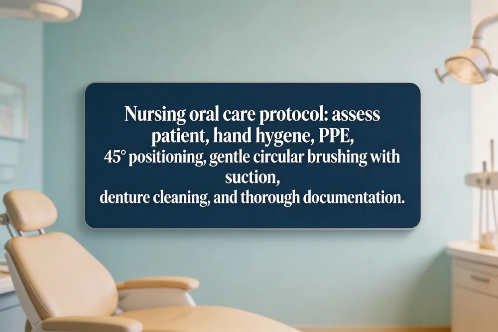 Oral health is defined as a state of complete physical, mental, and social well‑being of the mouth, teeth, gums, and supporting structures, enabling pain‑free eating, speaking, breathing, and smiling. Good oral health supports systemic health, reducing risks for diabetes, cardiovascular disease, and certain cancers. A typical “Oral Care Nursing Procedure” PDF outlines a step‑by‑step process for nurses: assess the patient, perform hand hygiene, don PPE, position the patient at a 45° angle, apply a pea‑sized amount of fluoride toothpaste, and brush each tooth and gum line with gentle circular motions while suctioning excess saliva. The guide also covers denture removal, cleaning, storage, moisturizers for dry mouth, and documentation of any lesions. Steps of oral care in nursing include gathering supplies, verifying patient identity, explaining the procedure, brushing each quadrant, cleaning the tongue, rinsing, and completing post‑care documentation. Oral hygiene can be mechanical (brushing, flossing), chemical (antimicrobial mouthwash, fluoride), professional (cleanings by a hygienist), or adjunctive (water flossers, tongue scrapers). PDFs summarizing these practices are available from reputable health agencies and can be customized for patients in high‑dependency settings.