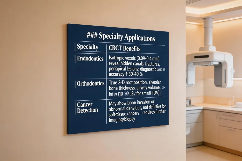 | CBCT has become an essential tool for complex endodontic cases. Its isotropic voxels (0.09‑0.4 mm) allow clinicians to locate hidden canals, vertical root fractures, and small periapical lesions that often escape 2‑D radiographs, improving diagnostic accuracy by up to 30‑40 % and supporting more successful root‑canal therapy. |