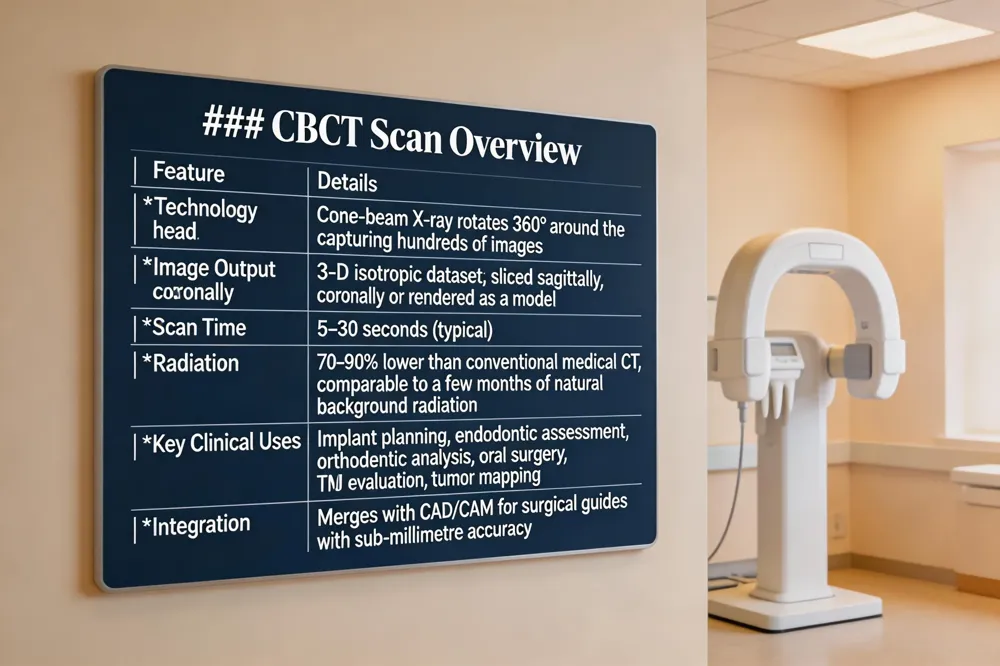 What is a CBCT scan used for? A CBCT scan provides 3‑D images of teeth, bone, nerves, and soft tissues, supporting implant planning, orthodontic assessment, root‑canal evaluation, jaw‑pathology diagnosis, and the design of guided surgical guides.
