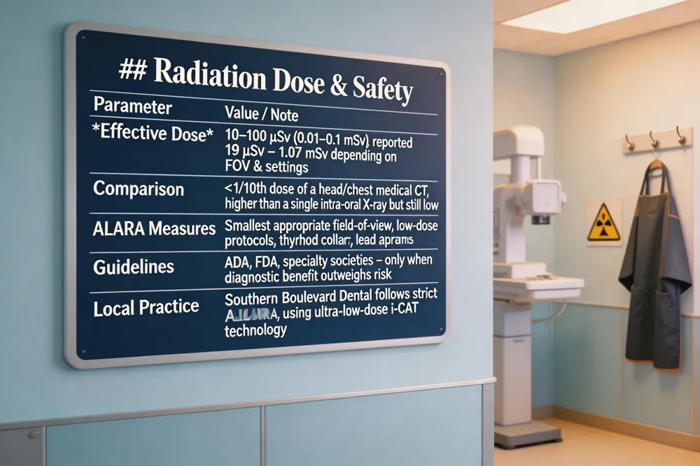 | A dental cone‑beam CT (CBCT) scan typically delivers an effective dose of roughly 10–100 µSv (0.01–0.1 mSv), which is comparable to a few days of natural background radiation. Reported values vary from about 19 µSv up to 1.07 mSv, depending on the field of view, voxel size, and scanner settings. Compared with a conventional medical CT of the head or chest, CBCT provides only a fraction of the dose—often less than one‑tenth—while offering far greater anatomical detail than 2‑D radiographs. Because CBCT radiation is still higher than a single intra‑oral or panoramic X‑ray, dental professionals follow strict radiation‑safety guidelines to keep exposure as low as reasonably achievable (ALARA). This includes selecting the smallest appropriate field of view, using low‑dose protocols, and employing protective devices such as thyroid collars and lead aprons. The American Dental Association, the FDA, and specialty societies recommend that CBCT be ordered only when the diagnostic benefit outweighs the minimal risk, and that clinicians review prior images to avoid unnecessary repeat scans. By adhering to these principles, practices like Southern Boulevard Dental in Rio Rancho ensure safe, precise imaging while maintaining patient comfort and confidence. |