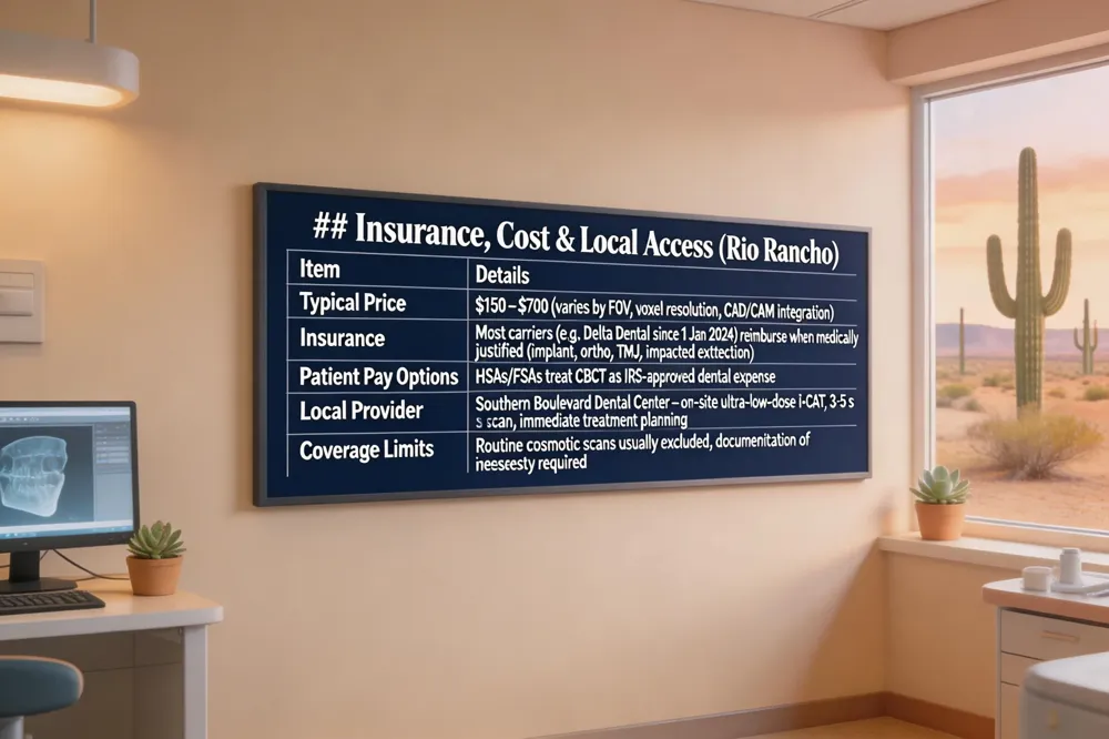 Pricing details vary by practice and scan scope. In Rio Rancho, a CBCT exam generally ranges from $150 to $700. The final cost reflects field‑of‑view size, voxel resolution, and whether the image is integrated with CAD/CAM planning. Insurance reimbursement can offset much of this fee when the provider documents medical necessity.