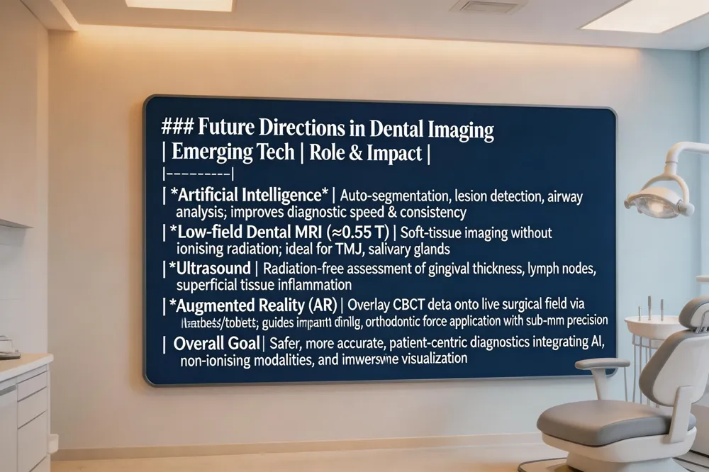 The next frontier is integration with augmented reality (AR). By merging CBCT volumetric data with AR headsets or tablet displays, clinicians can overlay a patient’s 3‑D anatomy onto the live surgical field. This real‑time visualization guides implant drilling, orthodontic force application, and maxillofacial reconstruction with sub‑millimetre precision, reducing operative time and improving patient confidence. Together, AI, non‑ionising modalities, and AR promise a more accurate, safer, and patient‑centred future for dental diagnostics.