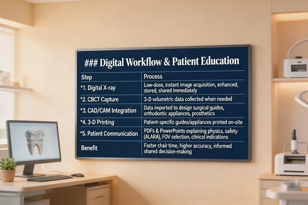 | Modern dental practices like Southern Boulevard Dental blend digital radiography, CAD/CAM, and 3‑D printing into a seamless workflow that puts patients at the center of care. Instant, low‑dose digital X‑rays provide high‑quality images that can be enhanced, stored, and shared with patients during the same visit, allowing immediate discussion of findings. When a case requires three‑dimensional insight—such as implant planning, complex endodontic diagnosis, or orthodontic evaluation—cone‑beam computed tomography (CBCT) supplies volumetric data that integrates directly with CAD/CAM software. The resulting virtual models are used to design precise surgical guides and 3‑D‑printed appliances, reducing chair time and improving accuracy. To keep patients informed, the practice offers downloadable PDFs and PowerPoint presentations that explain CBCT physics, radiation safety (ALARA), field‑of‑view selection, and clinical indications. These educational tools demystify the technology, reinforce the practice’s patient‑focused communication, and support shared decision‑making, ensuring that every treatment plan is both evidence‑based and comfortably understood. |